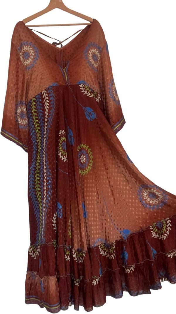 Look at this beautiful print! We found this dress at a fleamarket and the only label it carries is that it's made in India and 70% silk