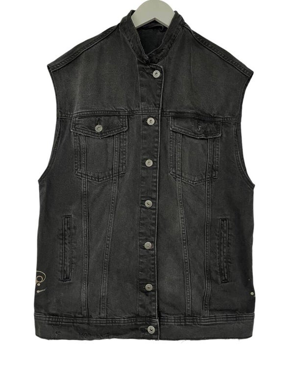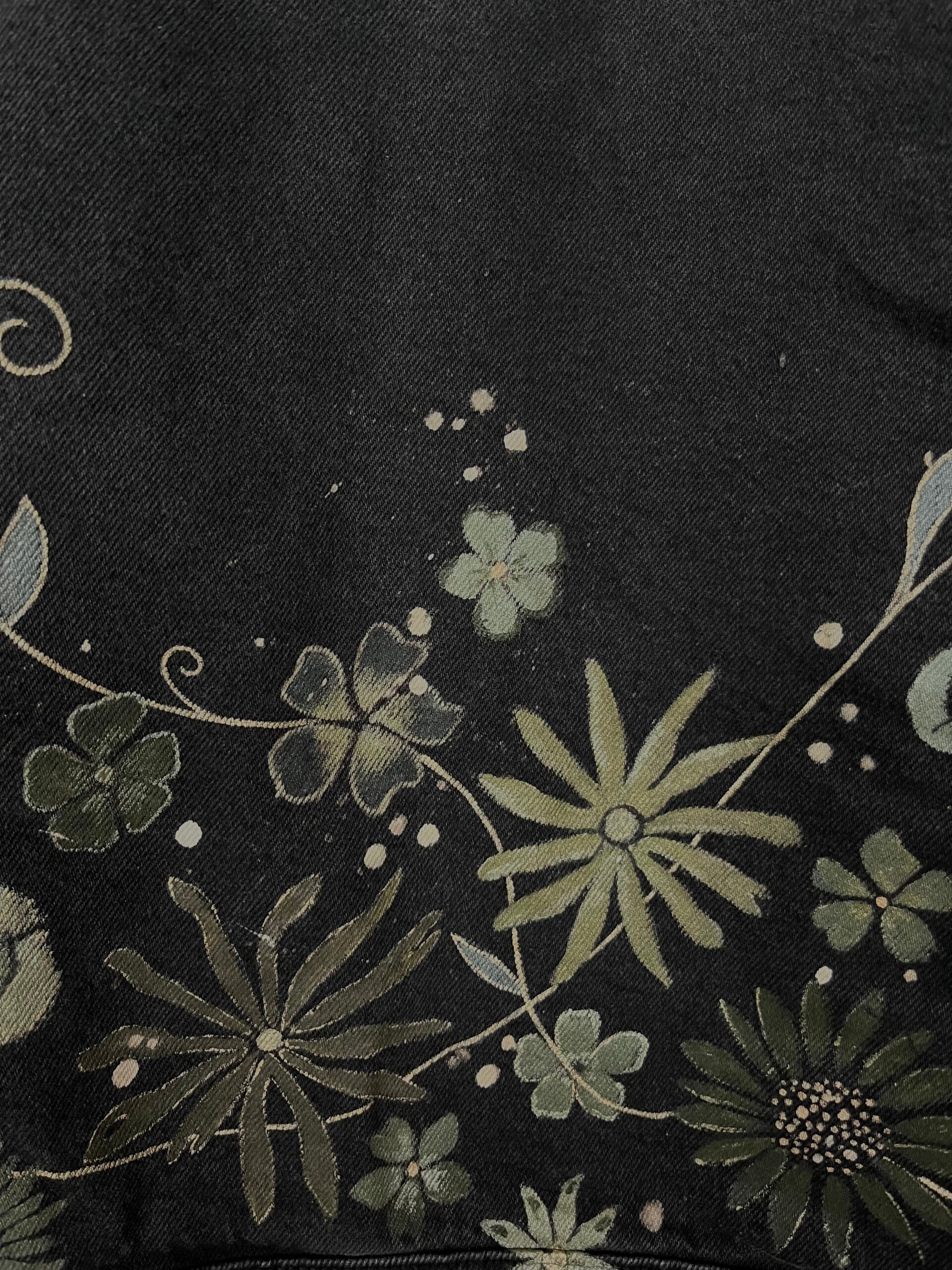 Dit was een gewoon regulier spijkerjasje gevonden bij een ReShare winkel. We hebben het omgetoverd in een mooi gilet met Mao kraag en handbeschilderde bloemen op de achterkant.