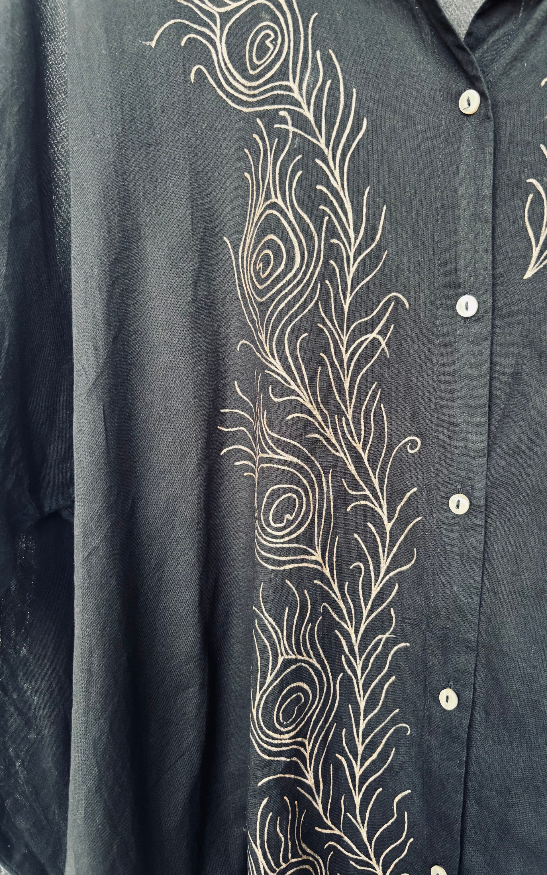 Heerlijke lange, doorzichtige doorknoop jurk met halflange ballonmouwen en handbeschilderde Pauweveren.